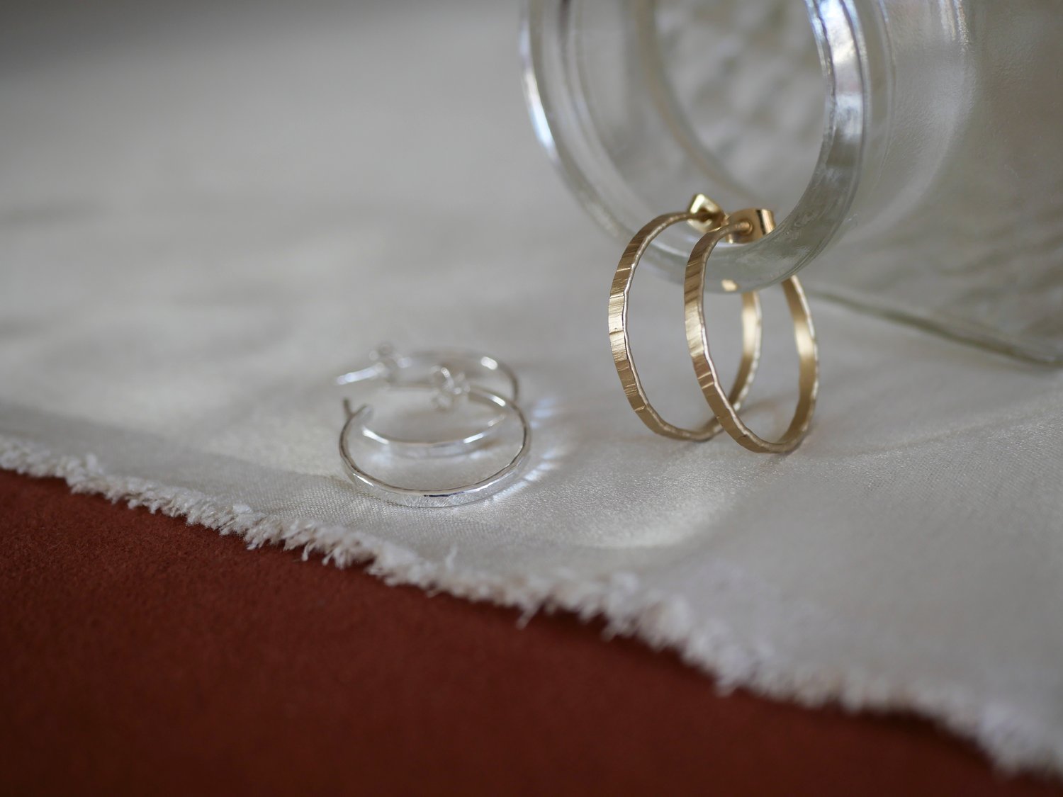 Boucles créoles, en fil martelé. Dorées à l'or fin 24 carats.
